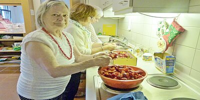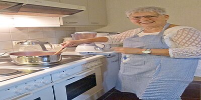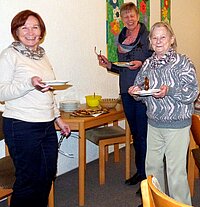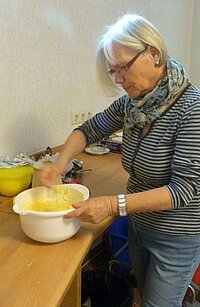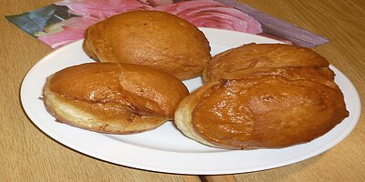 Dieser Programmpunkt stand für den 12. 6. auf unserem Terminplan. Maggie besorgte die dazu gehörigen Backzutaten und diverse Backutensilien. Frisch wurde ans Werk gegangen. Der 1. Hefeteig klappte vorzüglich, der 2. hatte ein Problem - es wurden dann aus dem Teig Amerikaner im Backofen gebacken, die auch sehr lecker waren. Die Herstellung der Ballen war sehr zeitaufwändig, denn wir klebten mit Eiweiß 2 Platten aufeinander, die vorher noch mit unserer selbst gemachten Erdbeermarmelade aus dem letzten Jahr gefüllt wurden. Die dafür vorgesehene Spritze, womit die Marmelade nach dem Backen eingespritzt wurde, funktionierte nicht, da unsere Marmelade zu dick und mit Fruchtstücken versehen war. Dank Brigitte, die ihre Geduld nicht verlor, erhielten wir traumhafte Ballen, die allen mit frisch gekochtem Kaffee sehr gut schmeckten.