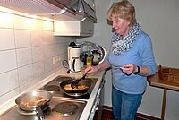 Die 10 Pfund Kartoffeln waren schnell geschält, der Teig mit Zwiebeln zubereitet und mit vielen Eiern aufgepeppt und dann ging es los mit der Backerei. Damit es nicht zu lange dauerte, benutzten wir 2 Pfannen. Der Duft der Reibeplätzchen durchzog den gesamten Kellerbereich und obwohl es erst 11 Uhr war, hatten wir alle schon schrecklichen Hunger! So frisch aus der Pfanne hat es allen vortrefflich geschmeckt!!! Wir aßen die heißen Reibekuchen mit frisch gekochtem Apfelmus und süßem Quark.