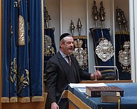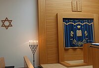 Dann sind wir in den Betraum gegangen, wo 400 Menschen Platz finden. Dort werden in einem Thoraschrein die Thorarollen hinter einem blauen Vorhang aufbewahrt. Die Thorarollen enthalten den ersten Teil der hebräischen Bibel. In den deutschen christlichen Bibelübersetzungen sind dies die fünf Bücher Mose.