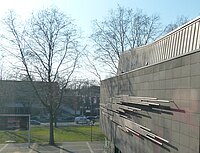 Aber das ist nicht die einzige Baukunst am Theater. An der Seitenwand des kleinen Hauses hängt von allen Seiten gut sichtbar auch noch eine Röhrenplastik von Norbert Kricke.