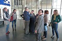 Pünktlich um 15 Uhr ging es mit der Führung los. Zunächst erhielten wir eine Info über den Bau des Theaters in den 50er Jahren und dass er 14 Mill. D-Mark gekostet hat, über die Kuriositäten, warum ein Vorhang angebracht werden musste (damit die Leute draußen nicht die Theaterbesucher sehen konnten) und warum das Blau an den Wänden kein Schalkeblau ist, sondern von Yves Klein entwickelt wurde und heute weltweit Interessenten anreisen, um dieses Blau zu bewundern.