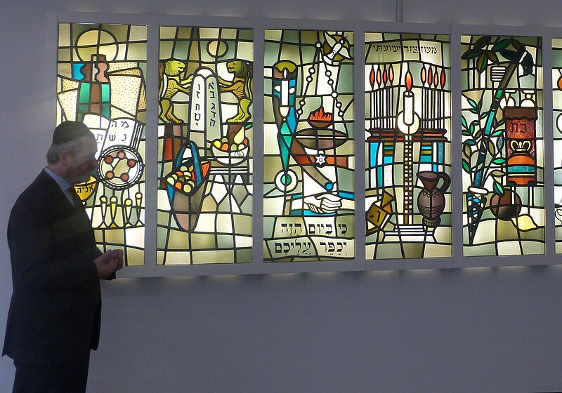 Hallo, liebe Leserinnen und Leser! Am 25. April, also an einem Dienstag, haben wir mit unserem Kreativkreis die Neue Synagoge in der Georgstraße besichtigt. Sie ist das Zentrum der Jüdischen Gemeinde in Gelsenkirchen. Die erste Synagoge an dieser Stelle wurde 1885 eingeweiht, wurde aber abgebrannt. 2004 wurde der Grundstein für die neue Synagoge gelegt, die 2007 eingeweiht wurde. Zuerst besichtigten wir mit dem Rabbi die bunten Glasfenster in der ersten Etage, die aus der alten Synagoge stammen. Diese zeigen jüdische Feiertage auf, z.B. das Pessachfest und das Chanukkafest. Das Pessachfest welches auch das „Fest der ungesäuerten Brote“ genannt wird, gehört zu den wichtigsten Festen der Juden und es dauert 7 Tage. Die Speisen in dieser Zeit werden auf besonderem Geschirr serviert und nach Ende der Feiertage wieder weggepackt. Das Fest erinnert an die biblische Erzählung vom Auszug aus Ägypten. Am Chanukka, dem Weihefest, wird der Neueinweihung des Tempels in Jerusalem gedacht. r