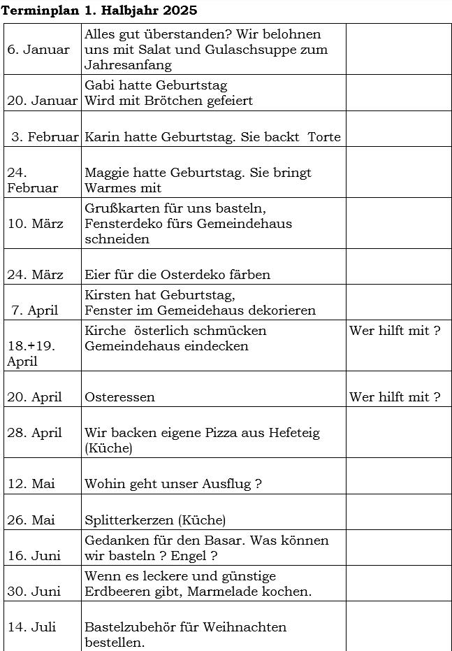 Da wir kein Kurs sind, fallen keinerlei Gebühren an. Dennoch erstellen wir für uns für jedes halbe Jahr einen Terminplan, damit keine Langeweile aufkommen kann. Im Gemeindehaus unserer Kirchengemeinde haben wir einen hübschen Raum, den wir mittlerweile mit gemalten Bildern, genähtem Wandbehang und einem Schrank vom Speicher des Gemeindehauses recht heimelig eingerichtet haben.